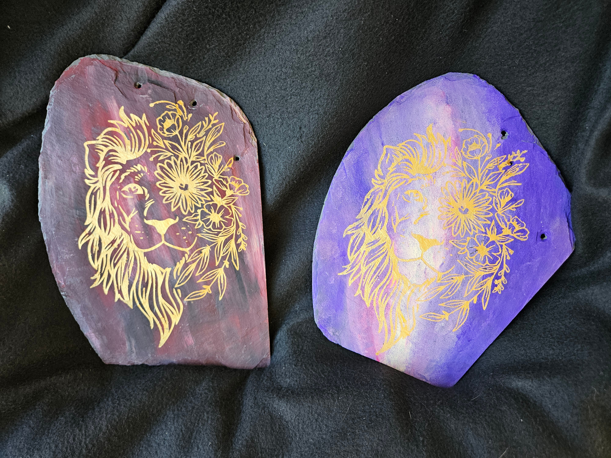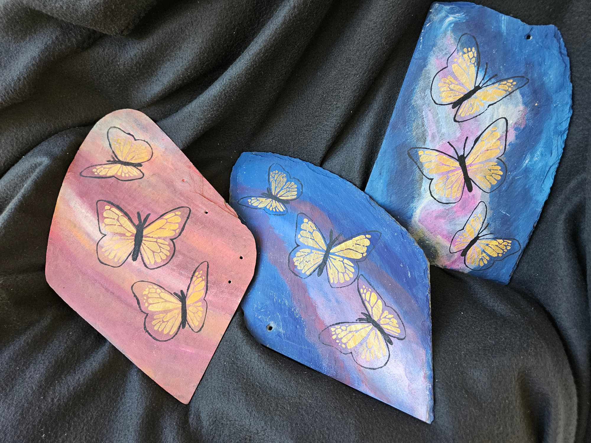 Schieferplatten, -Untersetzer und -Schilder in verschiedenen Größen, farbenfroh bemalt.